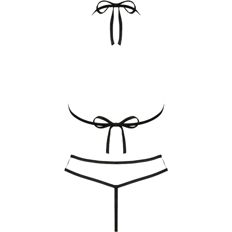 El inusual y picante conjunto de Jimena se compone de sujetador y tanga a juego. Las cintas negras acentúan además su carácter seductor.