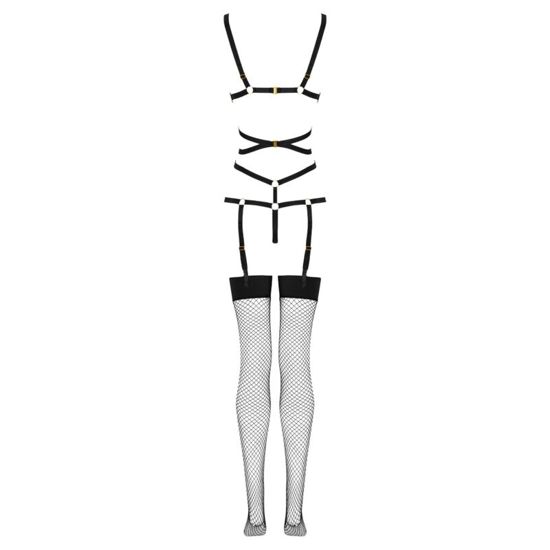 La parte superior del conjunto consta de sexys rayas negras, entrelazadas en el vientre y conectadas con anillos. Los tirantes de la parte superior rodean elegantemente el busto sin cubrirlo, mientras que en la parte inferior se transforman suavemente en un tanga. Tiras individuales corren a ambos lados del tanga, abrazando encantadoramente las caderas. La parte inferior del conjunto se compone de medias negras de largo regulable, confeccionadas en malla. Las medias se sujetan con broches al elemento superior del conjunto, por delante y por detrás.